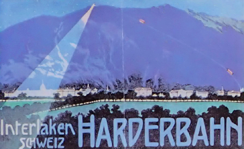 Weithin sichtbar schickt er seinen gebündelten Strahl in die Tiefen des Bödeli. Nichts ist sicher vor seinem grellen Licht, nichts bleibt ungesehen. Wer weiss, wie viele glückliche Stunden in den lauen Sommernächten jäh unterbrochen worden sind. Durch die Allgemeine Elektrizitäts-Gesellschaft A.E.G. in Berlin — als Navigationsscheinwerfer für ein Kriegsschiff gebaut - fand er den Weg als «günstige Gelegenheit» auf den Harder Kulm. Die Maschinenfabrik Oerlikon lieferte die nötige Umformergruppe, um den Scheinwerfer mit Gleichstrom zu versorgen. Ein Schaltschema, datiert vom 20.1X. 10 lässt vermuten, dass schon wenige Jahre nach Eröffnung der Harderbahn der Scheinwerfer als leuchtende Reklame zum Einsatz kam. Aus betrieblichen Gründen musste immer ein Maschinist der Bahn in der Bergstation übernachten. Dank dem Scheinwerfer hatte dieser das ausserordentliche Vergnügen, als Einziger in der Gegend «fernzusehen».